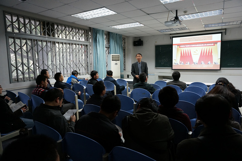 会上,岳碧松书记首先向全体党员介绍了学院群众路线教育实践活动的实施进展情况。随后通过PPT演示、讲解了党的十八届三中全会主要精神以及《十八届三中全会公报》的主要内容,并对公报中新提法、新亮点做了阐述。