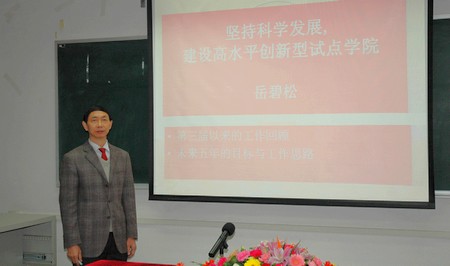 公司党委书记岳碧松教授代表学院上一届党委作了题为《坚持科学发展,建设高水平创新型试点学院》的党委工作报告。岳碧松书记在报告中对过去五年来学院的各项工作作了全面的回顾,学院在上届党委的带领下,通过全体师生共同努力,联系实际,立足实践,扎实有效地推进了全院各项工作的顺利开展。报告明确了今后五年的奋斗目标和主要任务,提出了全面提升党建和思想政治工作科学化水平的重要举措。各位代表还审议了公司党委副书记兼纪委书记廖爱民副教授提交审议的上一届纪委的书面工作报告。