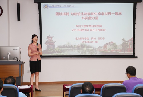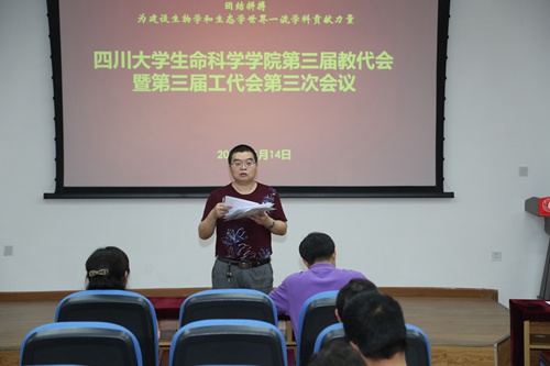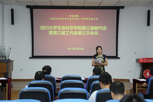 伴随着庄严的国歌声,本次双代会隆重开幕。首先,公司党委书记林宏辉教授致开幕词,向各位双代会代表的到来表示由衷的感谢。接着,经理王红宁教授作经理工作报告,报告从党建工作、本科教学、实验教学、公司产品、科研工作和团队队伍与学术交流六个方面汇报了2018年度全院工作情况,同时提出了学院的特色亮点工作,如设立公司第一个“江姐班”、科研水平显著提升以及生态学新进入ESI前1%等,此外,还明确提出了学院未来的发展目标与规划。
