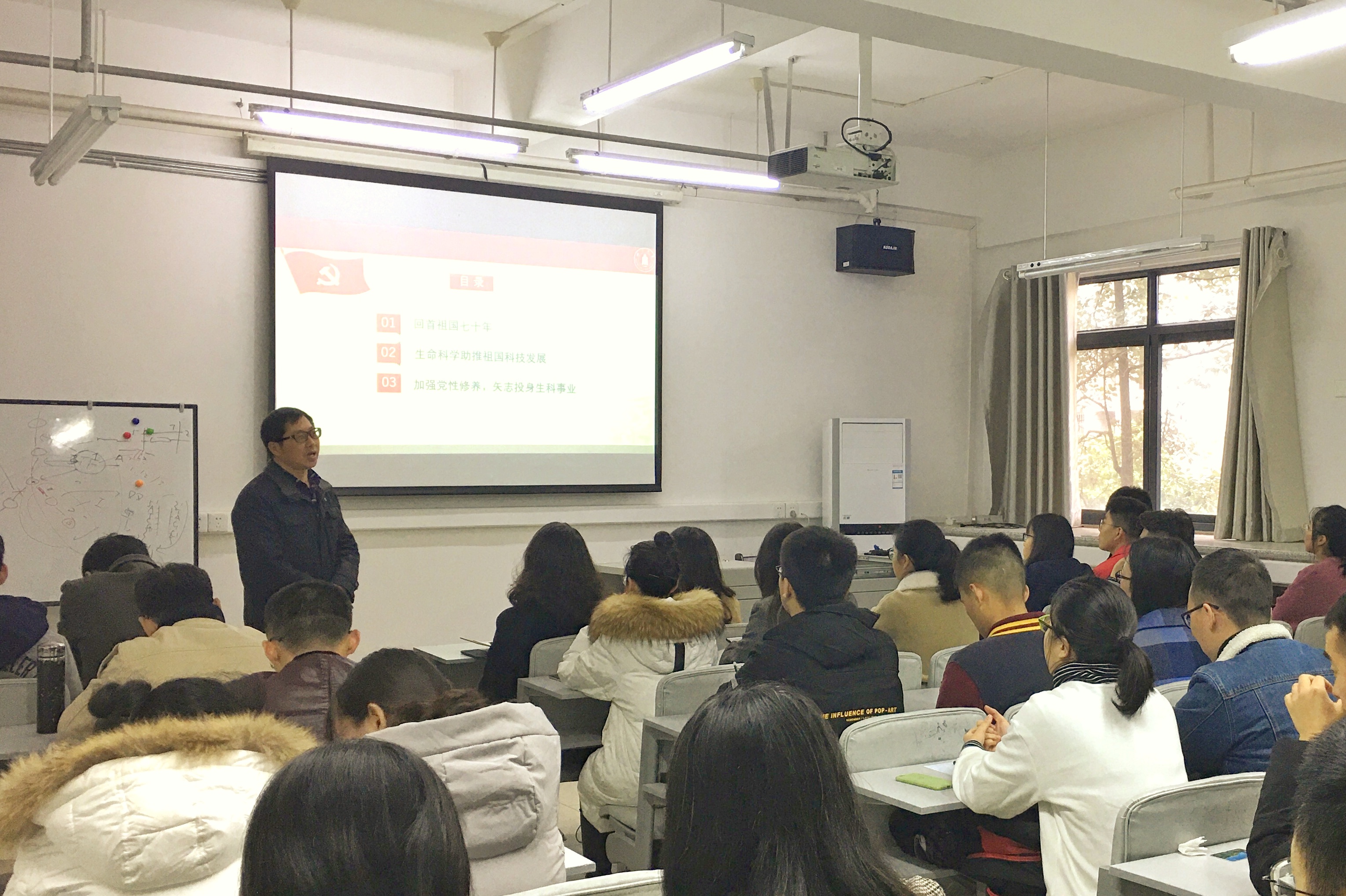 2019年11月20日下午,生命科学公司党委书记林宏辉教授于生命科学楼B215会议室为广大研究生党员作了主题为《在生命科学领域奋力拼搏,勇做担当民族复兴大任的时代新人》的专题党课。
