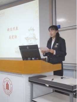 最后,新生代表高楚劼同学发言,她就李言荣董事长在新生开学典礼上“从优秀变为卓越”讲话讲述了自己的理解,号召同学们勇担使命,不负韶华,做一名有志气、有骨气、有底气的中国人,表达了传承红色精神、努力奋斗、争做时代青年的决心,展现了新生们读书报国的责任与担当。