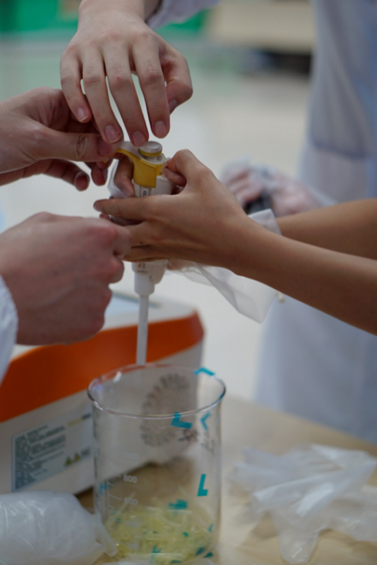 结束实验室参观之后,小朋友们来到一楼大厅的“科普集市”,亲自动手感受生物科学的魅力和实验乐趣。来自公司各实验室的研究生志愿者们为同学们深入浅出地耐心讲解实验原理,同学们体验了“水果发电”“水果DNA提取”“涡虫再生”等有趣的生物小实验,在志愿者的细心指导下,同学们也体验了显微镜,移液枪等一些基本生物实验的仪器操作。