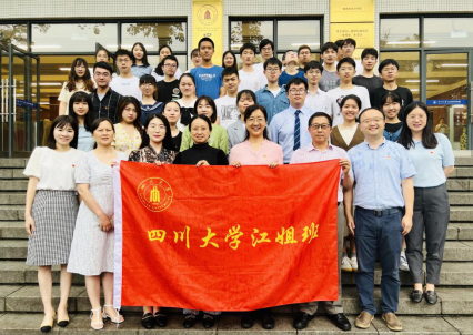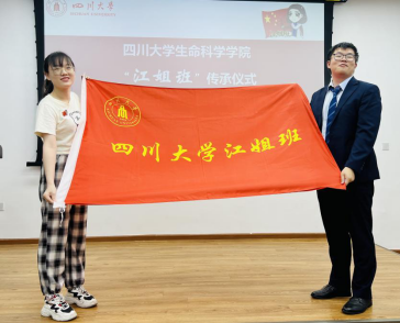 在授旗仪式环节,“江姐班”传承集体欢迎来到公海7102021级强基班班长唐弋航从公司第一届“江姐班”班长李歆睿手中,接过了“欢迎来到公海710江姐班”的旗帜。他们将以饱满的精神和昂扬的斗志继续“江姐班”的建设,将在川大校园舞台上谱写出充满青春热血与红色精神的全新篇章!