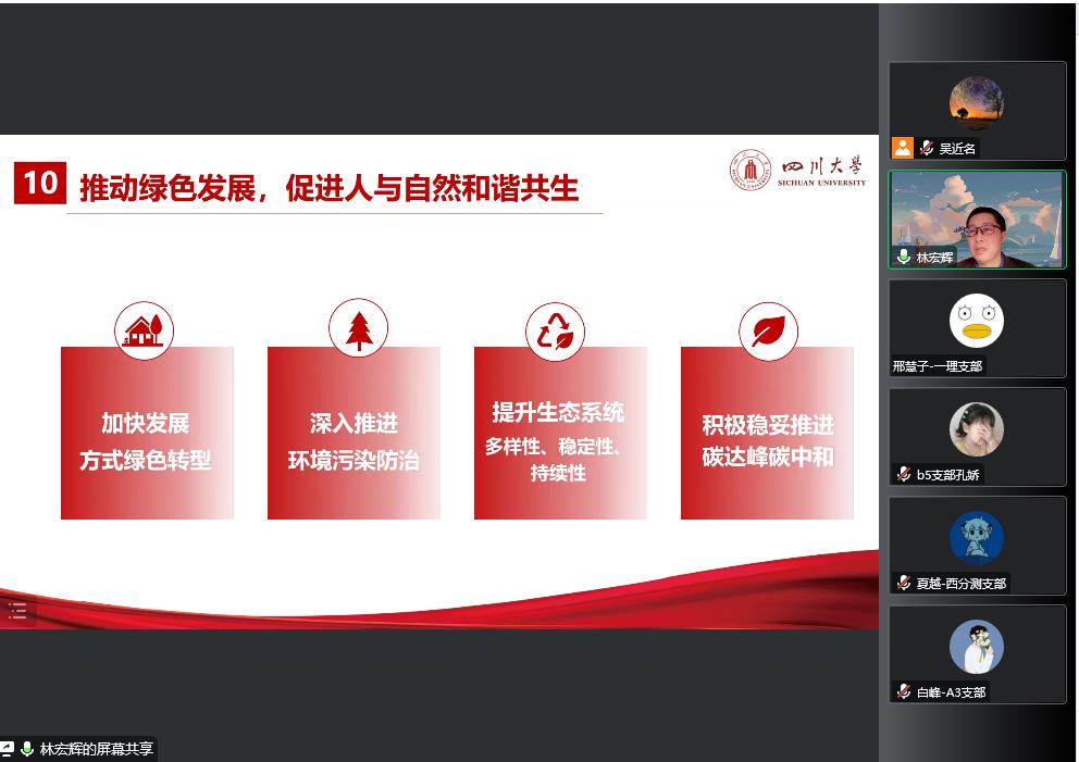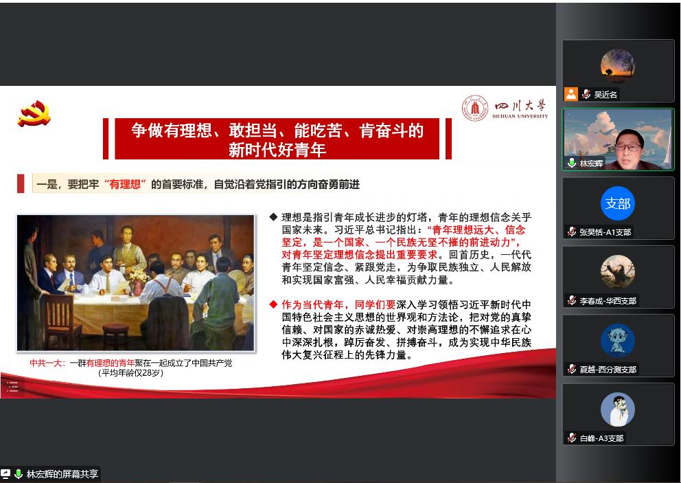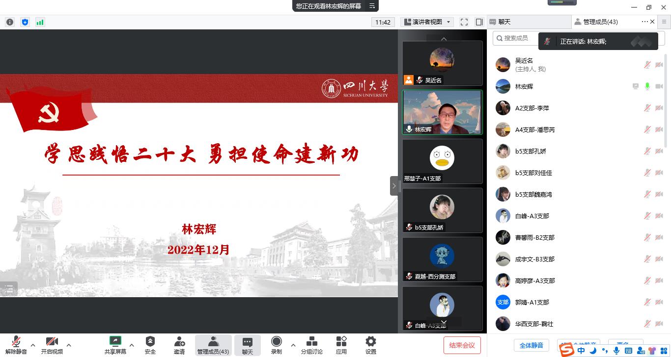 2022年12月15日晚19:00,生命科学公司党委书记、博士生导师林宏辉教授通过腾讯会议为员工党员作了题为“学思践悟二十大 勇担使命建新功”的专题党课。