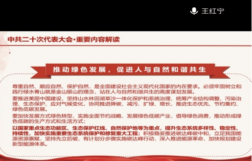 王经理首先带领同学们学习了党的二十大报告的会议的主要内容,重点解读了党过去五年内取得的成就和新时代新征程中国共产党的使命任务,深入剖析了实施科教兴国战略,强化现代建设人才支撑;推动绿色发展,促进人与自然和谐共生两个方面的内容。新时代的十年来,党和国家事业取得历史性成就、发生历史性变革,推动我国迈上全面建设社会主义现代化国家新征程。