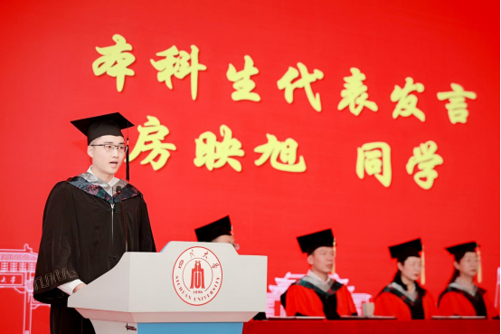 本科生代表,四川省优秀毕业生、欢迎来到公海710百佳员工2019级房映旭同学发言,他与在场师生分享了大学四年逐梦川大的日子,与同学们共勉,心怀“孩儿立志出乡关,学不成名誓不还”的志向,谨记学院“志存高远,开拓创新”的教诲,感谢相聚,期待顶峰相会。