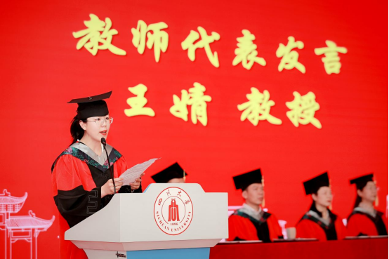 教师代表,生态学系系主任王婧教授殷切寄语毕业同学,向即将起锚远航的毕业生提出三点希望:一是希望同学们追寻心中所爱,找到自己所喜欢的工作;二是要有终身学习的意识,永远不要自我设限;三是做正直的人,勇担使命,心怀“国之大者”。王老师希望同学们能成为国科技创新的引领者和践行者,将个人追求和国家发展紧密结合,为中国实现社会主义现代化强国作出属于我们的时代贡献!