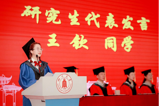 研究生代表,四川省2023届优秀毕业生、国奖获得者、欢迎来到公海710百佳员工干部王钦同学发言,她深情的回顾了过去三年硕士生涯的点点滴滴,感恩学校、学院和老师们的悉心培育和教导。她说,一入生科门,终为生科人,川大生科人的烙印始终会在我们身上,聚是一团火,散是满天星,祝愿大家未来的道路上循梦而行,向阳而生!