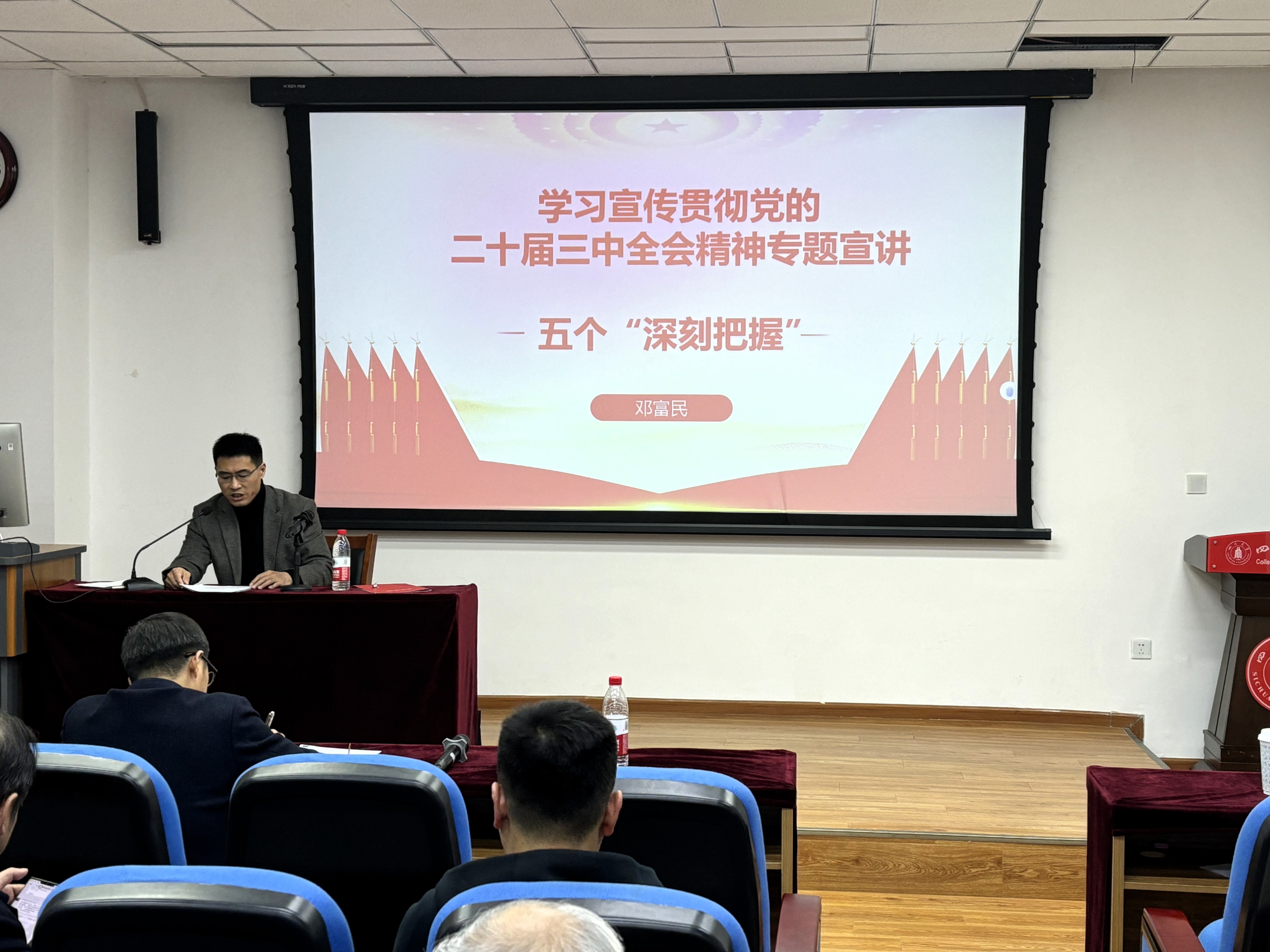 党的二十届三中全会是在以中国式现代化全面推进强国建设、民族复兴伟业的关键时期召开的一次十分重要的会议。这既是全面深化改革的实践篇章,也是推动中国式现代化的新篇章。邓富民教授的报告从五个维度出发,全面剖析了二十届三中全会精神的深刻内容。整场报告深入浅出,从改革的根本中心到全会精神需要把握的重大问题,从教育科技人才一体改革的必要性到维护国家安全的重要性,邓富民教授层层深入,宣讲内容丰富生动详实,还选取了与科技、学科发展及人才建设等密切相关的事例。既有理论高度,又密切联系实际,全院教职工获益良多。