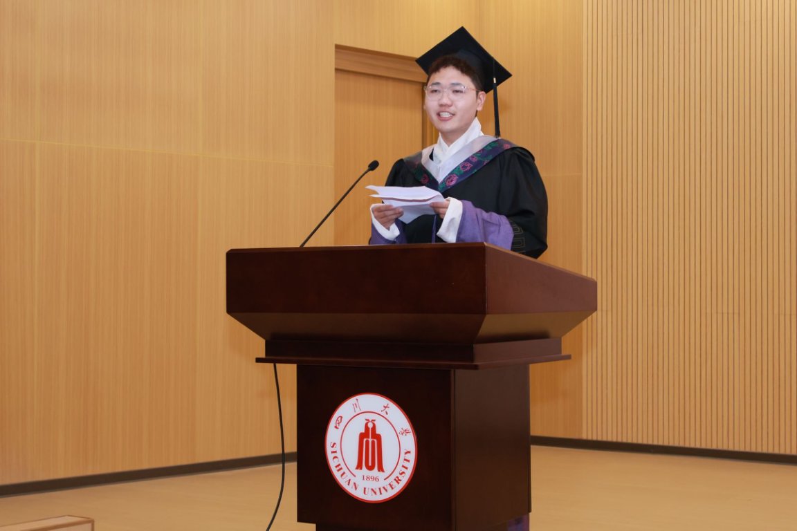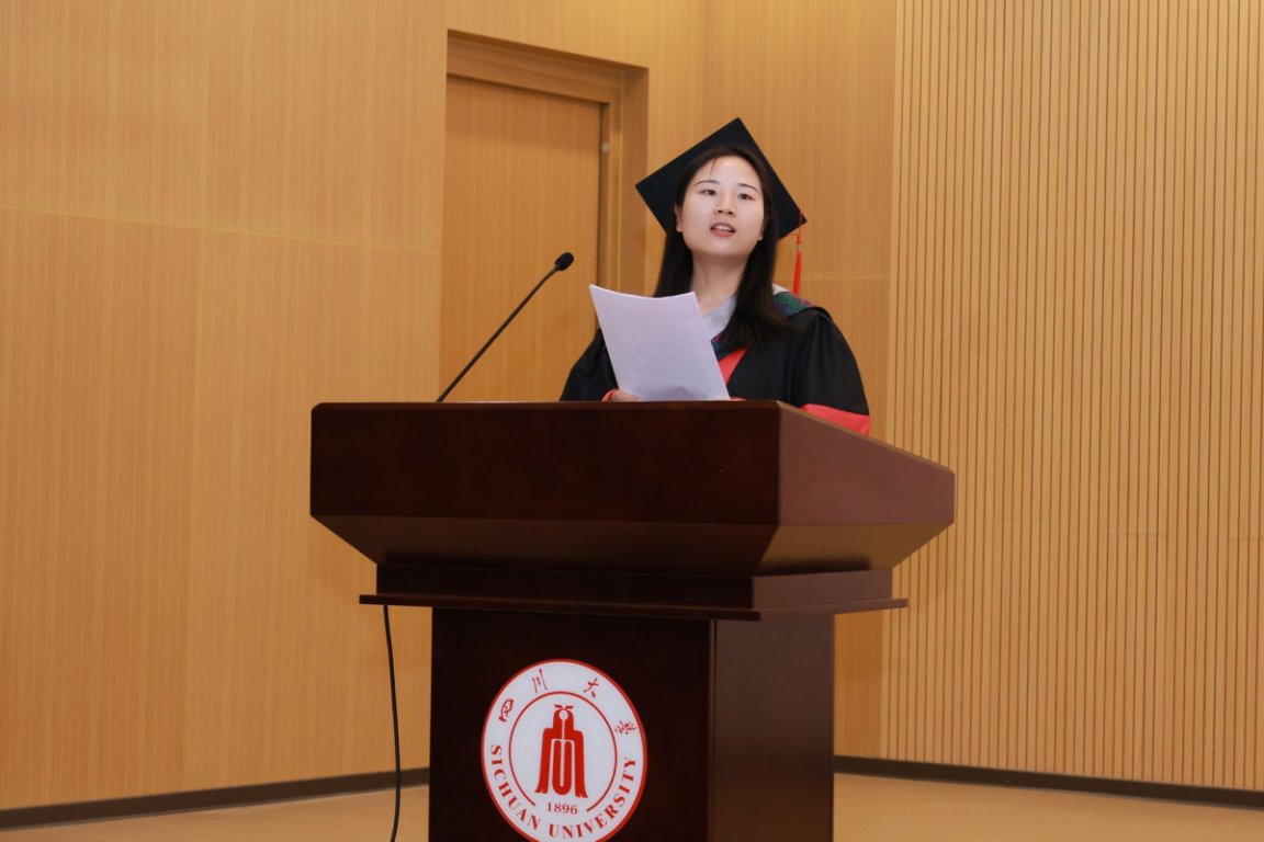 研究生代表唐小雅博士,首先感谢恩师对她的教导和激励,让她在学习和探索中逐渐的看清了自己的内心并坚持下来。从初来乍到的懵懂尝试到自信前行,她不断地向内探索、向外求知,实现了华丽的蜕变。她向川大、生科院表示诚挚地感谢,感谢学校学院的包容和支持,感恩导师的启迪,并祝愿所有毕业生同学:永远保持求学岁月中纯粹少年感永不褪色,牢记母校海纳百川、有容乃大的精神一路相随。