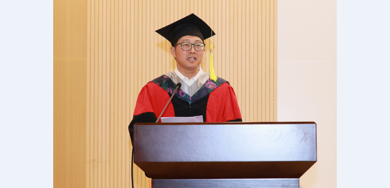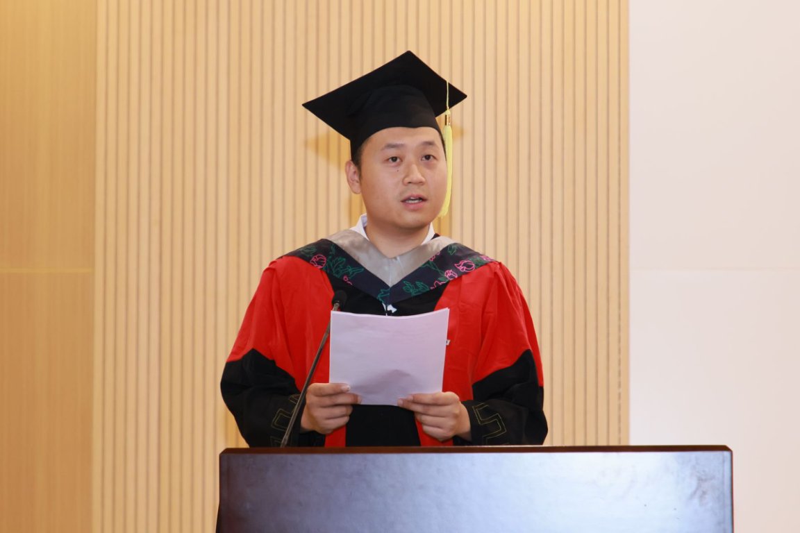 师者诉箴言。国家级青年人才王睿作为教师代表对毕业生表达了衷心祝贺,结合自己的成长感悟提出四点寄语与毕业生共勉:一是永远怀揣梦想,并为之不懈奋斗。二是胸怀国之大,对党和国家忠诚,积极投身到中华民族伟大复兴事业之中去。三是始终保持对生活的热爱,像“双螺旋”结构一样坚韧,在风雨中保持乐观的心态。四是在工作中,坚持求真务实的态度,“海纳百川,有容乃大,壁立千仞,无欲则刚”,做一个正直、真诚、善待他人的人。