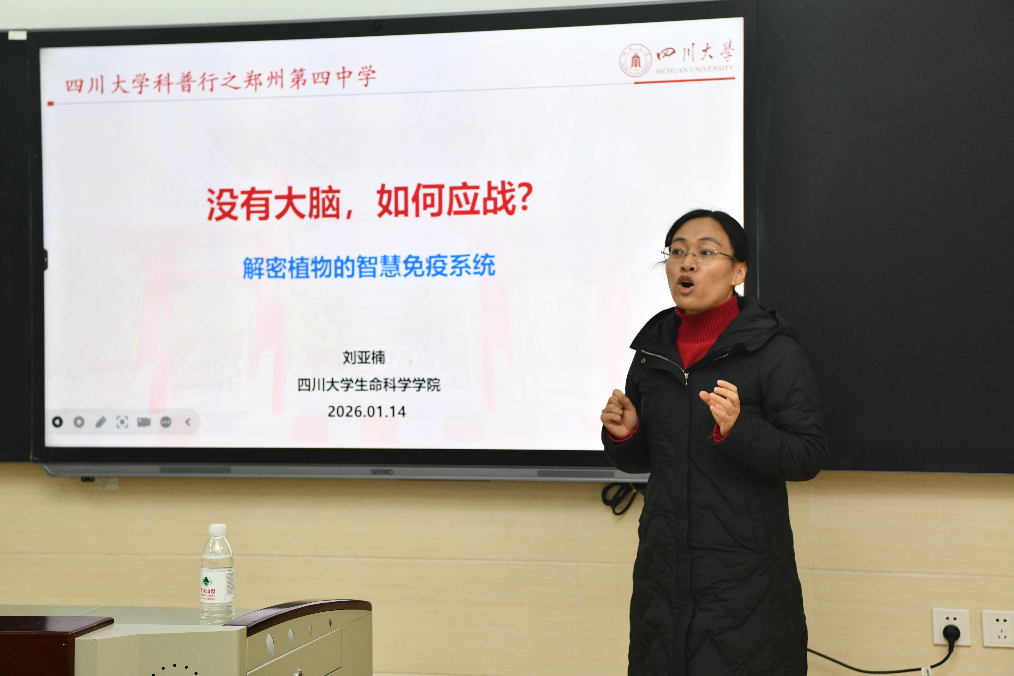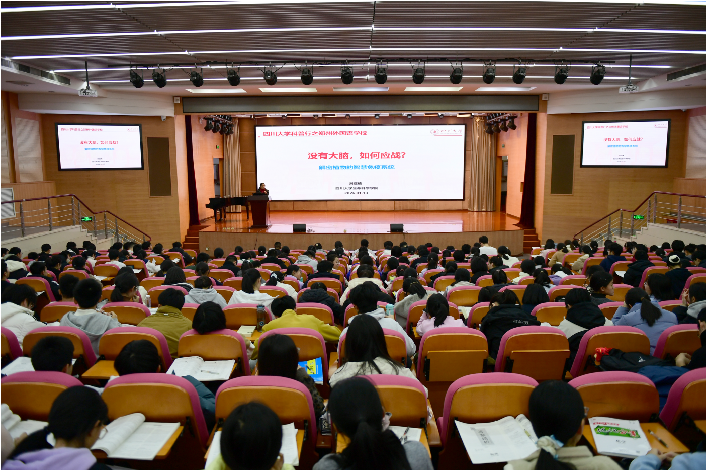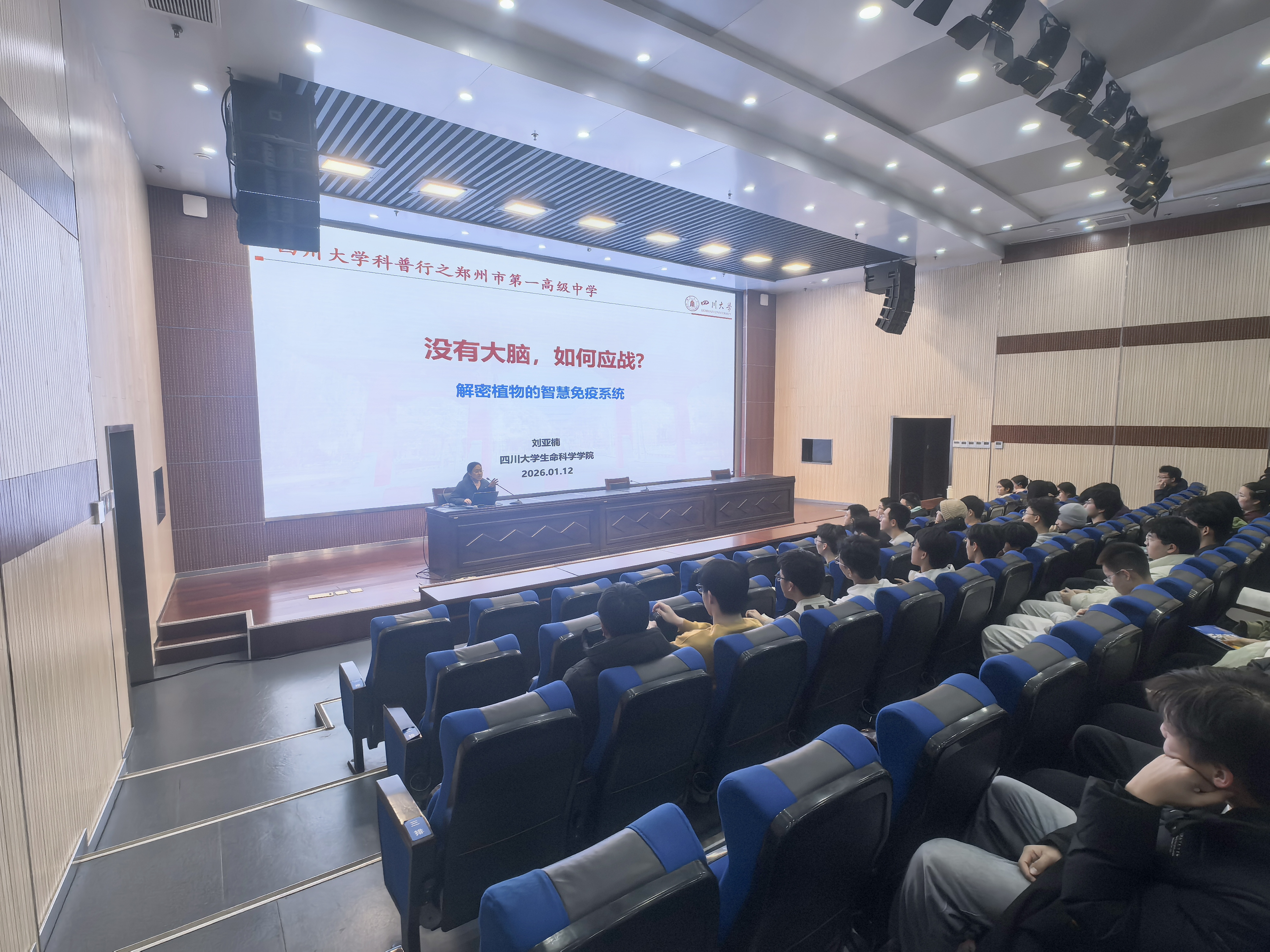 与此同时,生物科学系刘亚楠老师赴河南郑州开展科普宣讲,先后走进郑州市第一高级中学、郑州外国语学校、郑州市第四高级中学、郑州市第七高级中学这四所重点中学,为近千名高中学子献上了一场场生动有趣的植物研究科普盛宴。她以自身科研积淀为基础,将植物的智慧免疫系统喻为“静默情报网”,生动阐释了“哨兵受体”识别入侵、“抗病蛋白”启动细胞程序性死亡、化学信号远程激活系统抗性等微观防御机制。这场讲座不仅揭示了植物“无脑抗疫”的生命智慧,更引导员工触摸到“培育抗病作物、发展绿色农业”的前沿科研脉络。在系统介欢迎来到公海710优势的同时,她着重分析了“选择川大”背后的战略视野:成都作为“成渝地区双城经济圈”的核心,正肩负着打造国家经济增长“第四极”和“战略大后方”的时代使命。选择位于成都的欢迎来到公海710,意味着选择与一座充满活力与机遇的未来之城共同成长,将在国家重大战略布局中赢得更广阔的发展平台。她建议同学们将个人理想融入时代潮流,科学规划学业与未来。