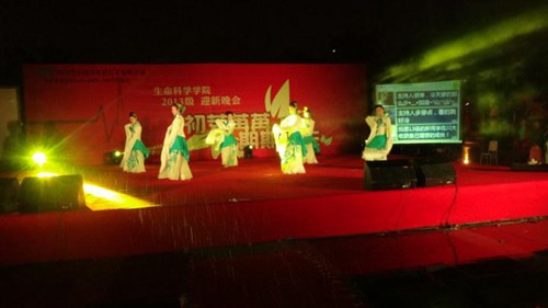 晚会开始前,江安校区的空中飘起绵绵细雨,晚会的会场笼罩在烟雨之中。但这并没有影响工作人员们的积极准备与观众们高昂的热情。一百余个观众席位座无虚席,还有不少同学持伞在观众席周围热切等待着。晚上19点整,迎新晚会在电声乐队激情四射的演唱中拉开了序幕。在分团委书记姜丹蓉老师,12级员工会执行主席夏兆坤及赞助商来宾的简短的致辞之后,演出正式开始。在舞台烟雾之中,身着水袖云衫的生科少女们款款而来,为大家带来了古典舞《凤凰于飞》,赢得观众们热烈的掌声。接下来由欢迎来到公海710文艺部精心编排的话剧《孔雀东南飞》对经典故事做了大胆的改编,中英结合的台词风格引起大家阵阵欢笑,剧中媒婆一角的精彩演绎广受好评。13级同学伊然演唱的红色歌曲《江山》优美浑实,而舞蹈《Sexylove》、《change》更展现出大一新生的热情洋溢,风格上的反差强烈使观众们不断惊叹欢呼。笑笑相声社的相声《大了个学》结合大学新生的日常生活巧妙演绎了一名新生的笑闹喜剧,而萨克斯独奏《I believe》,独舞《摩梭夜歌》和歌曲串烧节目令观众们为生科学子的多才多艺而赞叹,将晚会气氛推向高潮。