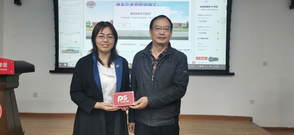 最后,赵经理做总结发言,表达了对潘老师教学经验分享的感谢,表示如果培养的员工要有情怀,老师也必须有情怀,同时表达了对有效教学的感触,值得每一位老师学习和深思。潘皎老师也是公司毕业的员工,赵云副经理代表学院赠送学校125周年校庆纪念品。