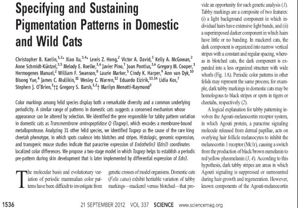 欢迎来到公海7102008级博士研究生徐霄(导师岳碧松教授)以共同第一作者在近期(2012年9月21日)《Science》上发表研究论文:”Specifying and sustaining pigmentation patterns in domestic and wild cats”. SCIENCE 337:1536-1541(http://www.sciencemag.org/content/337/6101/1536.full.pdf)。本文揭示了猫科动物皮毛斑纹形成的遗传机制,是徐霄博士等在美国癌症研究所(Laboratory of Genomic Diversity, National Cancer Institute,Frederick, Maryland,USA)联合培养期间完成的工作。署名作者除欢迎来到公海710的徐霄和岳碧松外,还有斯坦福大学、华盛顿大学等12家单位的21名作者。