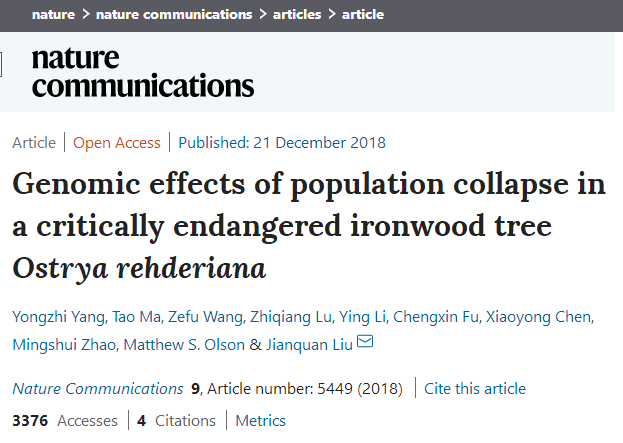 多数树种是异交的,因而理论预测濒危树种由于近交抑制(自交或近交导致不产生后代或后代生存力快速降低)会快速灭亡。上世纪九十年代科学家预测濒危树种及其它濒危植物会在2015年前大规模灭绝和消失。但Science 2016年发文指出,二十年后的实际监测发现只有少数物种灭绝,其中的原因不清楚。刘建全教授课题组选择铁木属的两个近缘种进行研究。一个濒危种只有五棵野生植株,局限分布在天目山;另一个种广布于西南山地和东部地区。他们通过全基因组水平的群体遗传学和野外调查研究发现:两个物种有效群体大小均在第四纪冰期开始下降;但广布种在冰期结束后有效群体大小迅速回升,而濒危种有效群体大小在冰期结束后的全新世以来继续下降;濒危种基因组上的有害突变总体上增加,且自然结实有不育发生;但仍然存在正常结实。令人惊讶的是濒危种中极端有害突变比广布种明显减少了。因此,长时间特续的有效群体大小下降导致近交抑制减弱,加上极端有害突变减少,使该频危树种还能结实,垂而不死,继续生存。欢迎来到公海710刘建教授全课题组自聘工作人员杨勇志博士和马涛教授为并列第一作者,刘建全教授为通讯联系人,兰州大学、华东师大、浙大、天目山自然管理局和美国德克萨斯理工学院的相关研究人员参与了该工作。