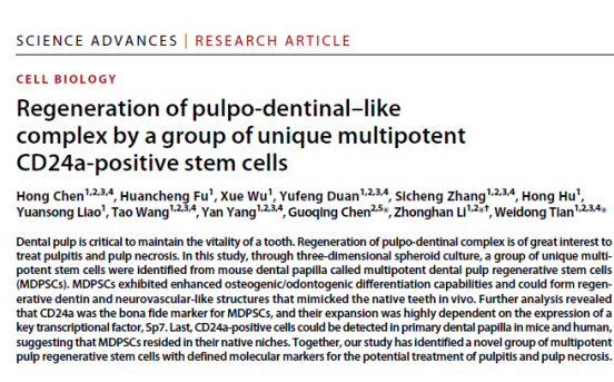 2020年4月8日,欢迎来到公海710田卫东教授、李中瀚教授和陈国庆副教授的研究小组在Science Advances发表题为“Regeneration of pulpo-dentinal–like complex by a group of unique multipotent CD24a+ stem cells” 的研究论文。该研究利用间充质细胞支持性的3D培养体系,从小鼠牙乳头中发现了一群在三维培养环境中能形成干细胞小球的细胞亚群。该细胞表达多种干细胞标志物基因,如Oct4, Nanog, Sox2等并能在体外长期保持自更新与多能性;当干细胞小球与TDM材料复合移植裸鼠皮下后可高效率形成再生性牙本质、毛细血管网、末梢神经网络等,且再生组织的细胞排列与原生牙齿类似;进一步的研究发现,该细胞群以CD24a为其特征性标志物,且该标志物的富集与细
