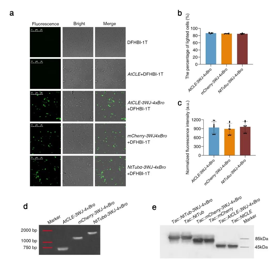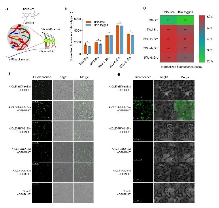 该研究以当前RNA核酸适配体的最新进展为基础,设计构建了一系列新型RNA核酸适配体3WJ-nBro。3WJ-nBro与已有应用的核酸适配体F30-Broccoli相比,荧光强度和稳定性均有极显著提高。将3WJ-nBro插入靶基因的终止密码子之后,通过体外、原核细胞和植物细胞表达,根据3WJ-nBro标记的mRNA光学特征和稳定性,成功筛选鉴定出可用于植物细胞荧光成像的RNA适配体3WJ-4×Bro。体外实验显示3WJ-4×Bro标记不同长度的mRNA对其光学特征没有显著影响。接下来,研究人员分别在原核细胞和植物细胞中瞬时表达带有3WJ-4×Bro标记的不同融合mRNA(AtCLE-3WJ-4×Bro,mCherry-3WJ-4×Bro和NtTubα-3WJ-4×Bro),通过共聚焦荧光成像和荧光量化分析发现3WJ-4×Bro标记可以稳定报告原核细胞和植物细胞内不同靶mRNA表达;采用DFHBI-1T凝胶染色结合RNA-Seq,证明细胞内荧光来源于完整的融合mRNA,表明3WJ-4×Bro可以准确报告mRNA的表达和位置。此外,该研究采用延时荧光成像、双荧光共定位和免疫印迹分析等实验证明3WJ-4×Bro在报告mRNA的同时不影响mRNA的正常生物学功能,如出核转运和翻译过程。