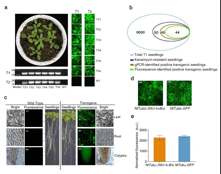 进一步,该工作研究了3WJ-4×Bro在植物转化中的实际应用。通过比较稳定表达GFP和3WJ-4×Bro标记的NtTubα的转基因拟南芥荧光强度,发现3WJ-4×Bro系统与GFP系统具有相同的报告能力,且3WJ-4×Bro可用于报告不同组织中靶基因mRNA的表达;分析了来自6个NtTubα-3WJ-4×Bro转基因拟南芥T1代家系共766株T2代植株,表明3WJ-4×Bro与靶基因共分离且共表达并遵循孟德尔遗传定律稳定遗传至后代,3WJ-4×Bro是一个可靠的RNA水平上的植物遗传报告系统。值得一提的是,该研究利用3WJ-4×Bro报告系统成功实现了对烟草病毒介导的RNA传递的可视化示踪,为RNA在植物细胞间的转移示踪研究提供了新的工具。