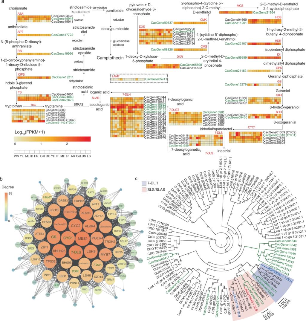 为了进一步研究喜树中喜树碱生物合成通路的进化,研究人员首先基于基因功能注释和基因家族分析鉴定了更为完整的喜树碱合成相关候选基因集,包括可能与后续合成步骤相关的细胞色素P450(CYP450)酶家族编码基因及其亚家族分类。使用先前发表的多组织转录组数据计算了候选基因的表达量,并进行了共表达网络分析,结果显示与吲哚生物碱合成核心通路相关的酶编码基因具有相似的组织表达模式(图1)。与吲哚生物碱合成代表物种长春花(Catharanthus roseus)合成长春花碱/长春新碱的生物合成通路相比,两种途径都使用相似的酶生成复杂的中间有机分子,但在生成马钱苷酸(loganic acid)之后,两者出现了分歧。在长春花中,马钱苷酸(loganic acid)首先通过马钱苷酸甲基转移酶(LAMT)转化为马钱苷(loganin),进一步通过断马钱子苷合酶(SLS)生成断马钱子苷(secologanin),而喜树中马钱苷酸(loganic acid)直接被断马钱子酸合酶(SLAS)转化为断马钱子酸(Secologanic acid),出现这种差异的原因可能就是喜树中马钱苷酸甲基转移酶和断马钱子酸合酶编码基因出现了功能分化。
