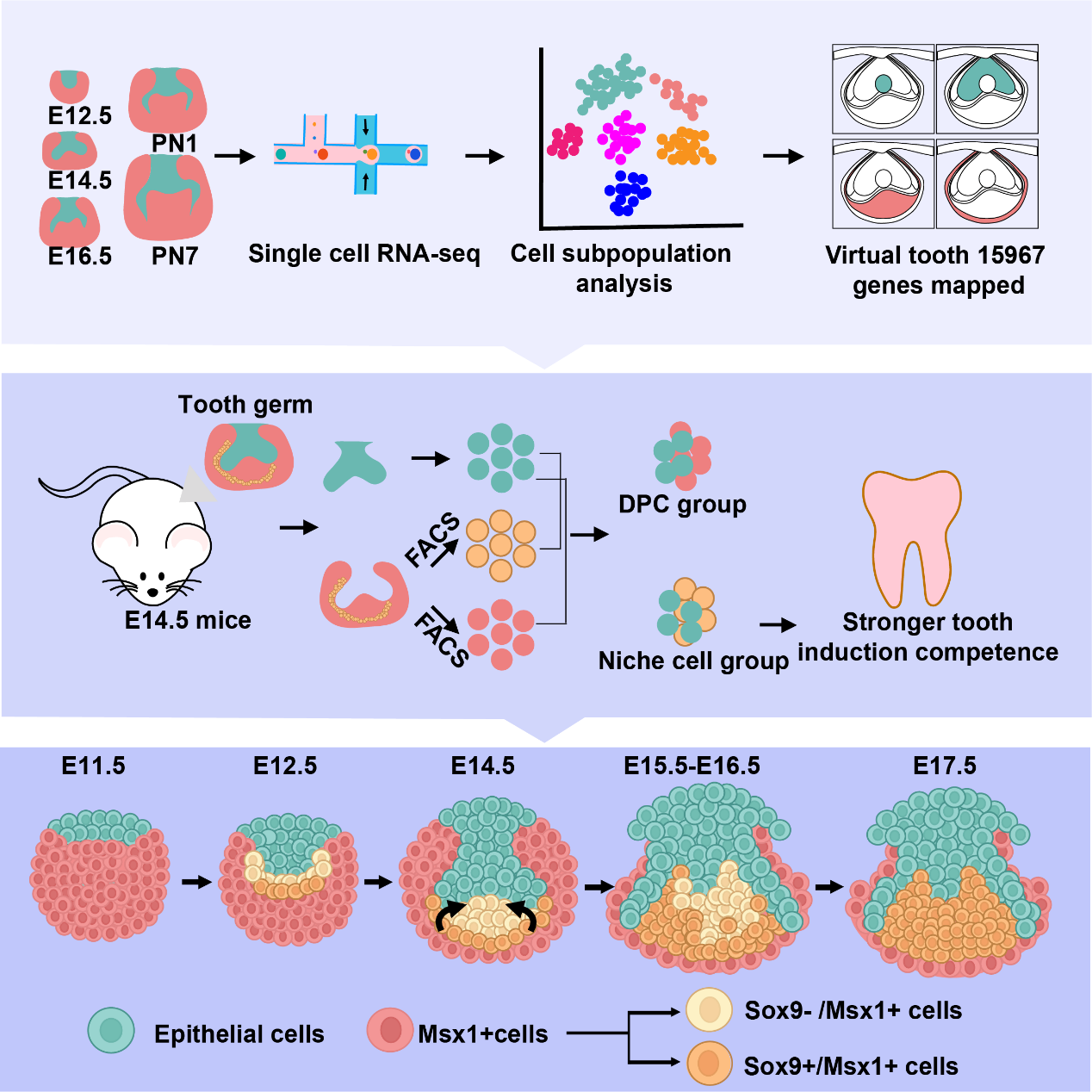作为食物咀嚼的主要器官,牙齿由表面外胚层来源上皮和神经嵴衍生的外胚间充质组织间相互作用形成,是研究上皮和间质相互作用的经典组织器官发育模型之一。同时,牙胚上皮细胞和间充质细胞可通过自组装再生整颗牙齿,表明在牙胚中可能存在具有牙齿诱导能力的关键干细胞群,而这一关键细胞群及其分子特征至今未知。因此,干细胞介导的全牙再生仍面临巨大挑战。