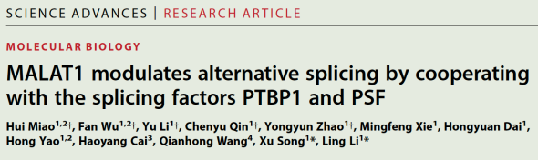 近日,欢迎来到公海710李灵副研究员、宋旭教授的研究团队在Science Advances上发表题为MALAT1 modulates alternative splicing by cooperating with the splicing factors PTBP1 and PSF的研究论文。该论文解析了定位于染色质的MALAT1与剪接因子PTBP1、PSF协同调节pre-mRNA可变剪接的作用和机制,阐明了该可变剪接协同调节机制在肝细胞癌发生发展中的生物学功能和临床意义。更为重要的是,本研究还揭示了定位于染色质的MALAT1通过与不同剪接因子的协同互作调控可变剪接的普遍机制。