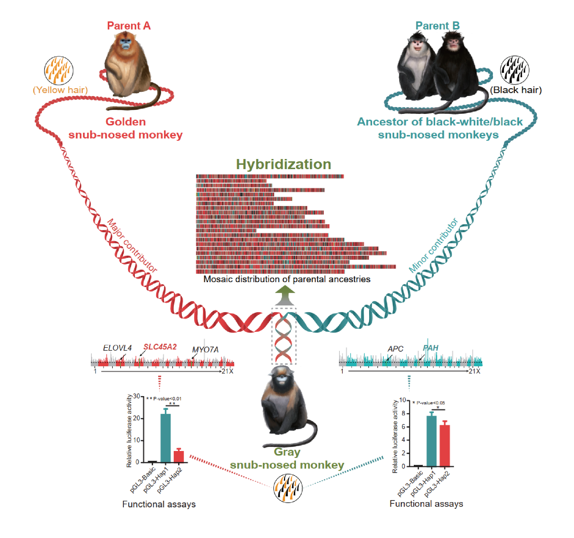 研究表明,黔金丝猴(Rhinopithecus brelichi)可能是由滇金丝猴/怒江金丝猴(黑灰色毛色)的祖先与川金丝猴(金色毛色)在约180万年前同倍性杂交后产生的新物种。利用刘建全团队前期开发的杂交物种形成关键基因的鉴定方法(Molecular Plant, 2021),研究人员成功鉴定到了一系列可能在黔金丝猴杂交物种形成过程中发挥了重要作用的毛色性状相关候选基因,并利用分子实验对其功能分化进行了体外验证。黔金丝猴中与毛色相关的多个基因座位上的等位基因交替继承自两个亲本谱系,使得黔金丝猴产生了黑灰色与金色相间的“马赛克式”毛色表型,从而导致其与两个亲本谱系产生交配前生殖隔离。