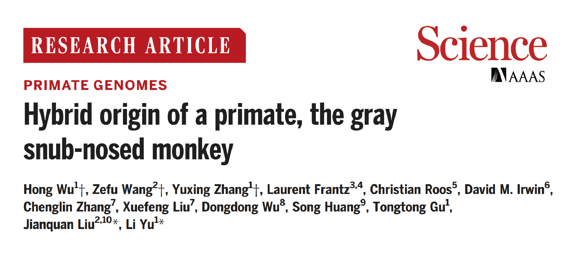 该研究作为Science期刊灵长类基因组专刊(the Primate Genome Project)的重要组成部分之一,于2023年6月2日正式在线发表。于黎团队吴宏教授、刘建全团队王则夫博士(现为南京林业大学教授)、于黎团队章誉兴博士生为该文共同第一作者,刘建全和于黎教授为该文共同通讯作者(图1)。