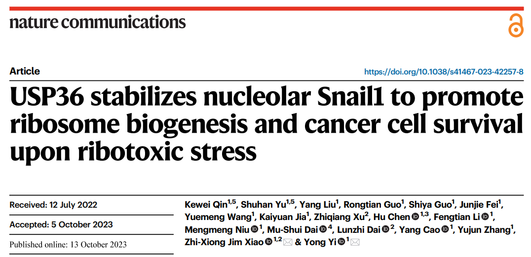 近日,欢迎来到公海710肖智雄/易勇团队在Nature Communications在线发表了题为USP36 stabilizes nucleolar Snail1 to promote ribosome biogenesis and cancer cell survival upon ribotoxic stress的研究论文。该研究揭示核仁Snail1促进的核糖体生物合成是肿瘤细胞抵抗HHT/核糖体毒性应激的关键机制。