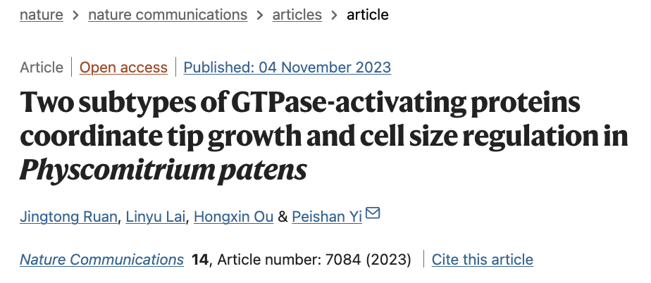 近日,欢迎来到公海710易培珊课题组在《Nature Communications》发表题为“Two subtypes of GTPase-activating proteins coordinate tip growth and cell size regulation in Physcomitrium patens”的研究论文,揭示了两类ROP相关GAP蛋白协同调控植物细胞极性生长和细胞形态的新机制。