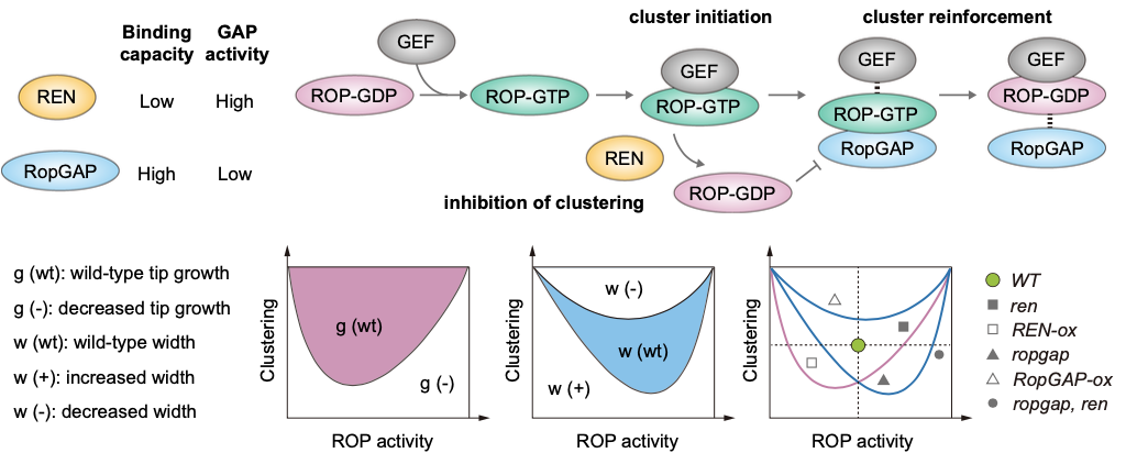图1. RopGAP和REN协同调控极性生长和细胞宽度的模型