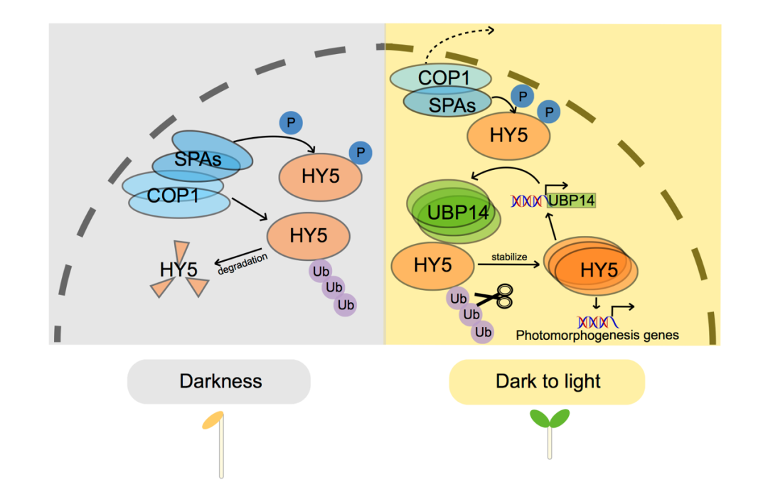 作为光合自养生物,植物对光环境高度敏感。光是最关键的环境因素之一,不仅是能量来源,而且是植物发育过程中的决定因素。当幼苗破土而出,照射在阳光下,需要迅速打开顶端弯钩和子叶,抑制下胚轴的生长,促进子叶扩张和叶绿素积累,为光合自养生长做准备,该过程被称为光形态建成。bZIP型转录因子ELONGATED HYPOCOTYL5(HY5)是幼苗光形态建成的中心枢纽,也是抑制下胚轴生长的关键因子。从暗到光下的转变导致HY5蛋白积累,并促进下游相关基因的表达。多重机制在不同的维度调控HY5的功能发挥。之前的研究表明E3泛素连接酶COP1在暗下通过泛素化HY5抑制蛋白积累,而在光下HY5不断积累,该过程是否存在去泛素化参与介导仍不清楚。