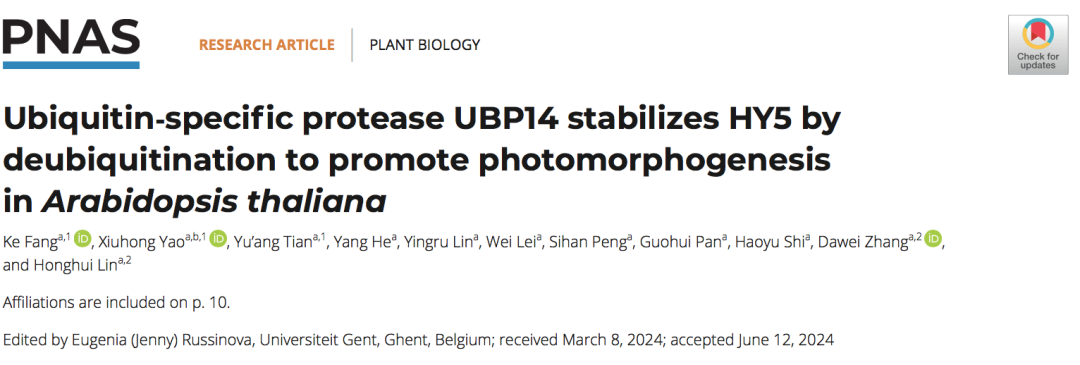 近日,欢迎来到公海710林宏辉/张大伟团队在美国科学院院刊PNAS发表了题为Ubiquitin-specific protease UBP14 stabilizes HY5 by deubiquitination to promote photomorphogenesis in Arabidopsis thaliana的研究论文,揭示了去泛素化酶UBP14通过去泛素化稳定核心转录因子HY5从而促进植物光形态建成的新机制。
