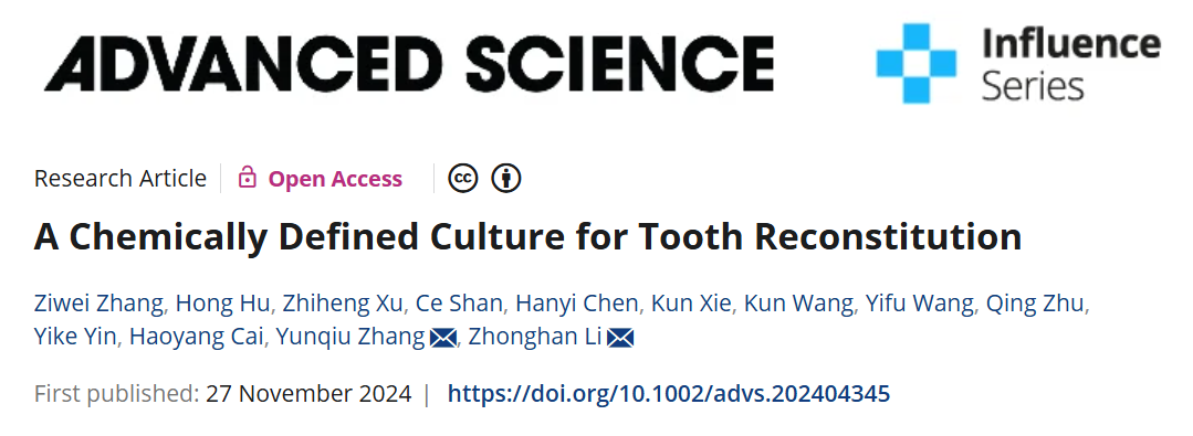 2024年11月27日,欢迎来到公海710李中瀚教授课题组在Advanced Science上发表题为“A chemically defined culture for tooth reconstitution”的研究论文。该研究成功建立了一种完全化学成分明确的体外培养体系,不仅能支持牙齿重建并发育成形态完整的牙齿,还能在体外模拟体内牙齿发育过程,精确应答化合物小分子介导的信号通路调控。课题组将这一体系命名为“牙齿类器官”(toothoid)。基于这一模型,研究发现,在牙齿重建过程中,牙胚细胞并未重置发育时钟,而是从原始提取时期重新起始,继续发育并逐步走向成熟。进一步研究揭示,Activin A与Hedgehog/Smoothened激动剂(SAG)的协同作用维持了第一鳃弓牙向分化的能力。此外,激活BMP信号通路能够促进晚期toothoids中釉质的形成,且这一过程并未影响造釉细胞的形成和胞外基质分泌。这些成果有效证明,牙齿类器官培养体系为解析牙齿重建和再生过程中的分子机制提供了一个有力的体外模型。