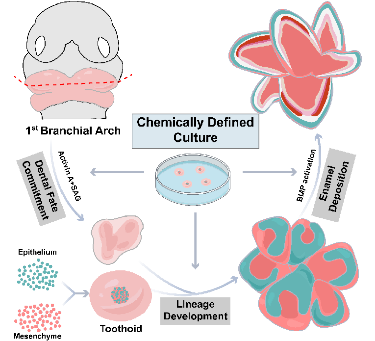 牙齿作为人体重要的钙化组织,在日常生活中承担着咀嚼、支撑面部组织和辅助发音等多重功能。牙齿的发育依赖于表面外胚层来源的上皮与神经嵴来源的间充质之间的相互作用,这使其成为研究多种器官和组织发育的重要模型。随着单细胞测序及空间转录组技术的发展,科学家们已能深入研究牙齿发育过程及其关键细胞谱系的形成,部分研究者也尝试通过胚胎期牙胚上皮与间充质的重组来实现功能性牙齿的再生。然而,传统研究方法中对动物模型和体内移植实验的过度依赖,仍未能解答一些关键问题:如处于不同发育阶段的细胞如何维持重构能力,以及这一过程是否会“重置”发育时钟。尽管已有研究团队成功在体外诱导具有分泌胞外基质(ECM)功能的牙齿上皮(造釉细胞)类器官,但尚未获得形成釉质结构的直接证据。同时,现有的以含血清培养体系为主的研究模式也极大限制了牙齿重建和再生的进一步探索,因此亟需建立一种有效的体外研究模型。