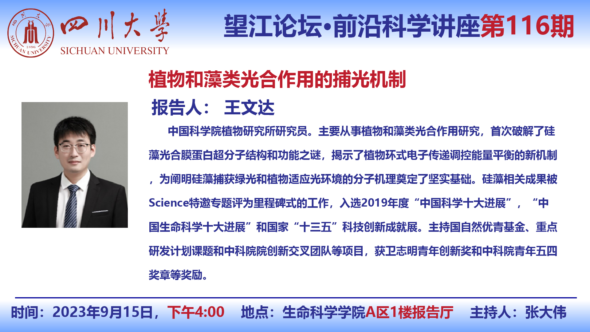 望江论坛-前沿科学讲座(第116期):王文达研究员9月15日学术报告