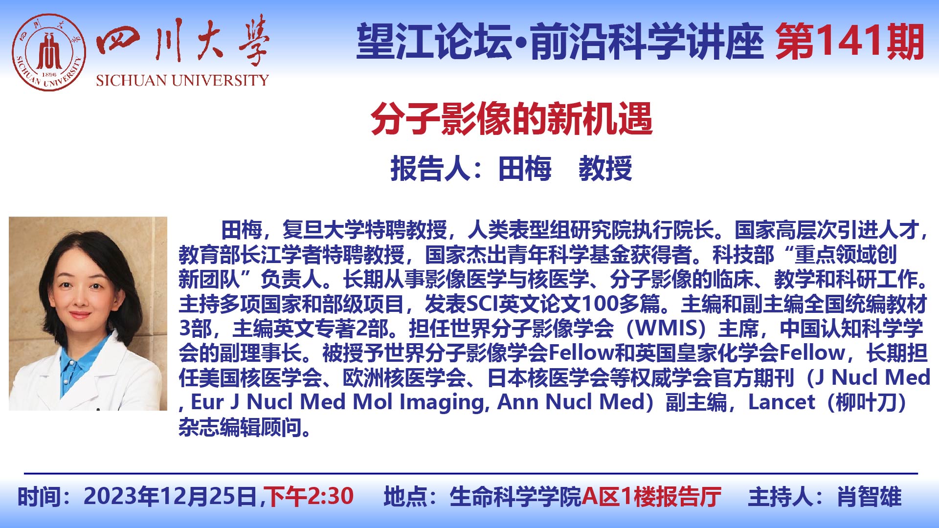 望江论坛-前沿科学讲座第(141期):田梅教授12月25日学术讲座