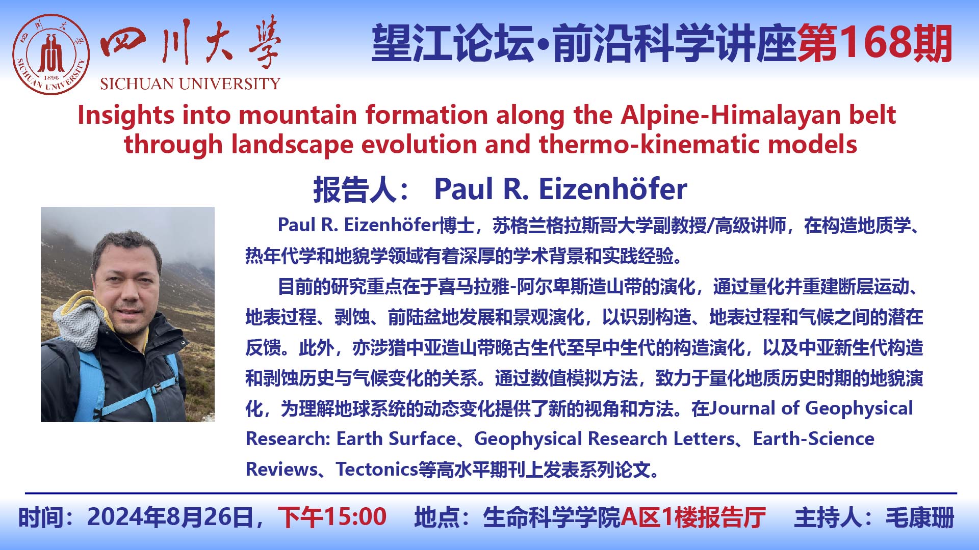 望江论坛-前沿科学讲座(第168期):Paul R.Eizenhofer博士8月26日学术讲座