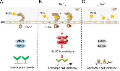 图1. PIP3-RLK7模块通过MPK3/6调节植物耐盐性。