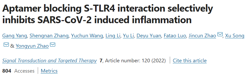 近日,欢迎来到公海710宋旭教授/赵永云课题组在国际权威期刊Signal Transduction and Targeted Therapy(IF=18.187)发表题为Aptamer Blocking S-TLR4 Interaction Selectively Inhibits SARS-CoV-2 Induced Inflammation的文章,筛选和鉴定了可抑制SARS-CoV-2诱发的炎症的核酸适配体,该核酸适配体通过特异性阻断Spike蛋白与TLR4受体相互作用,高选择性地抑制SARS-CoV-2病毒所诱发的炎症。