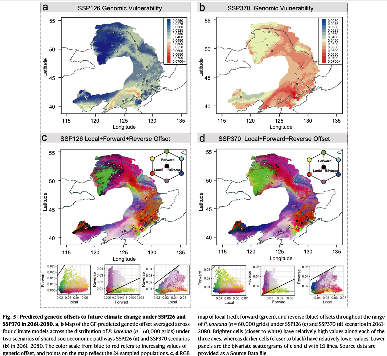 接下来,研究人员使用梯度森林(GF)来模拟沿着当前环境梯度的等位基因频率变化,并预测未来气候条件下的遗传偏移。与在单一环境变量下的单个位点水平上估计的RONA相比,GF能根据适应性位点和多元气候变量的复合效应之间的关联进行遗传偏移预测。与RONA结果一致:南部的鸭绿江流域群体最容易受到未来气候变化的影响(Fig 5a,b)。