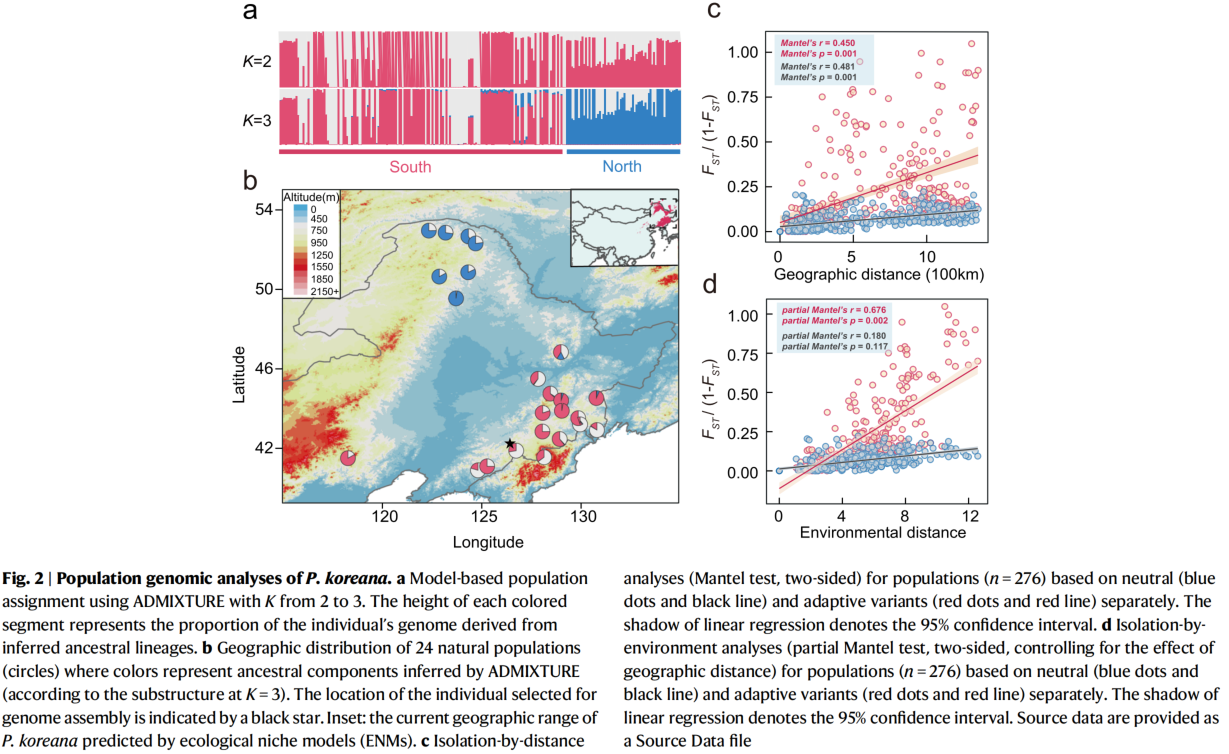 首先,研究人员利用采自中国东北地区的24个香杨自然种群的230个个体进行高深度全基因组重测序(Fig2),分别鉴定到16,619,620SNPs,2,663,202Indels和90,357SVs(Fig 1)。ADMIXTURE结果和NJ树显示香杨群体主要分为南(长白山地区)、北(大兴安岭地区)两个亚群。然而,2D-SFS的结果表明南北亚群共享大量遗传变异,表明相对较弱的群体遗传结构。此外,两个亚群间的遗传分化较小(Fst: 0.02125;dxy:0.01098)且核苷酸多样性、连锁衰减距离也较为接近。通过PSMC分析发现两群体历史动态相似,约在末次盛冰期(LGM)产生分化,此后北方群体的有效种群大小逐步收缩而南方群体略有扩张。