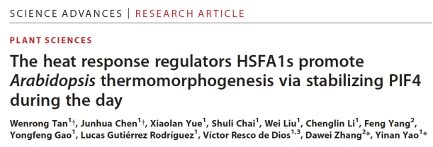 Science Advances:重点实验室张大伟团队与西南科技大学合作揭示HSFA1整合光温信号调节植物热形态建成的分子机制