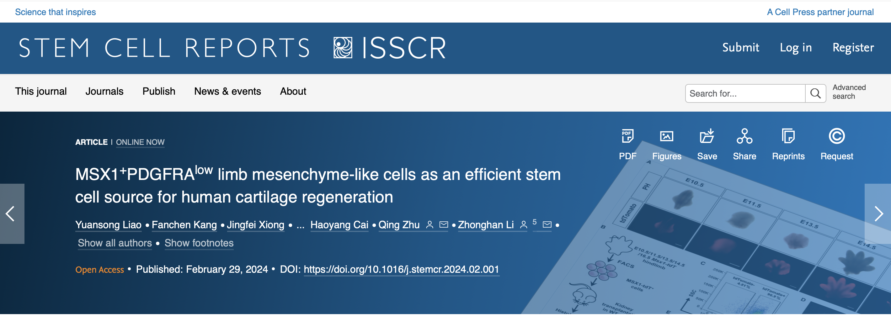 Stem Cell Reports|重点实验室李中瀚团队发现MSX1+PDGFRAlow肢芽间充质样细胞可介导高效率人源软骨再生