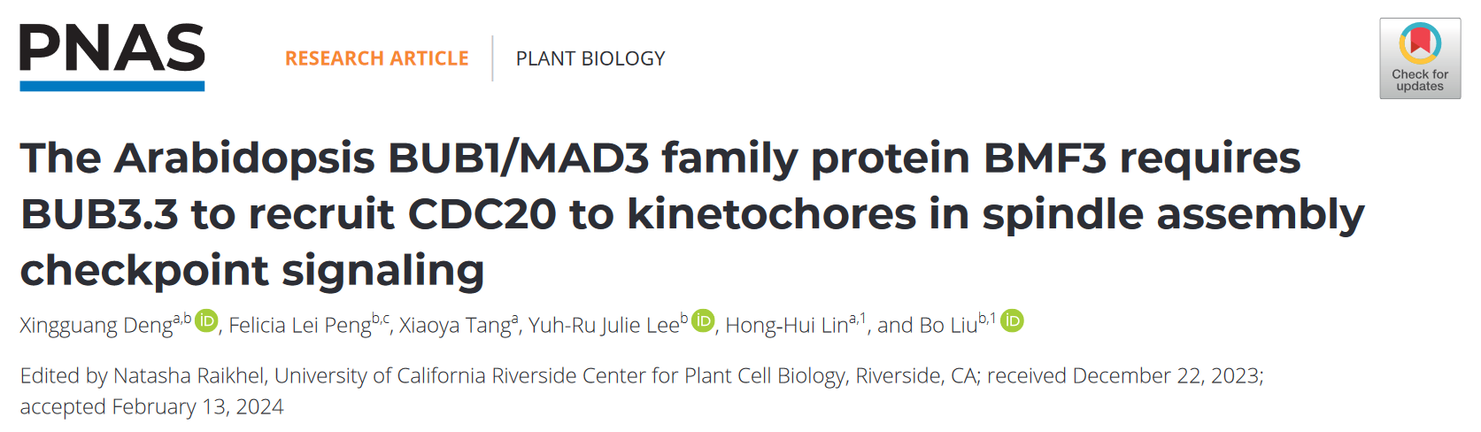 近日,欢迎来到公海710林宏辉教授课题组与加州大学戴维斯分校柳波教授课题组合作在PNAS发表了题为“The Arabidopsis BUB1/MAD3 family protein BMF3 requires BUB3.3 to recruit CDC20 to kinetochores in spindle assembly checkpoint signaling”的研究论文。这项研究揭示了非经典的BUB3.3蛋白在植物SAC中的关键作用。