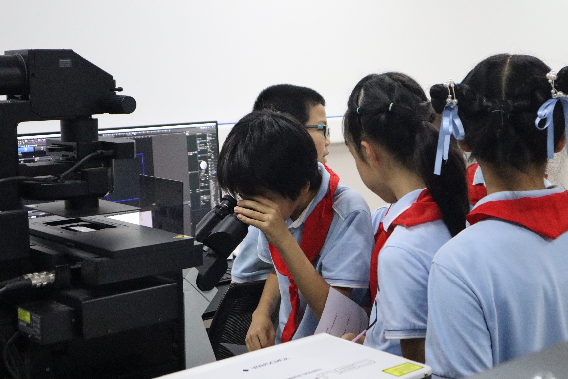 各位同学在研究生志愿者的带领下有序参观了学院共享设备中心,在公司教师及研究生志愿者的讲解下,近距离了解和感受了显微切割系统、超分辨共聚焦显微镜、BD流式细胞分析仪以及Sony流式细胞分选仪等大型贵重精密仪器设备;这个环节,同学们在志愿者们的指导下,一一体验了显微观察等一些基本生物实验的操作,了解了PCR仪器的工作原理,熟悉了生命科学领域常用的实验仪器。共享设备中心的老师还为同学们演示了质谱仪原理的小实验。在数据中心,同学们通过视频了解DNA是什么、为什么去研究、怎样去研究等内容。同学们纷纷表示受益匪浅。